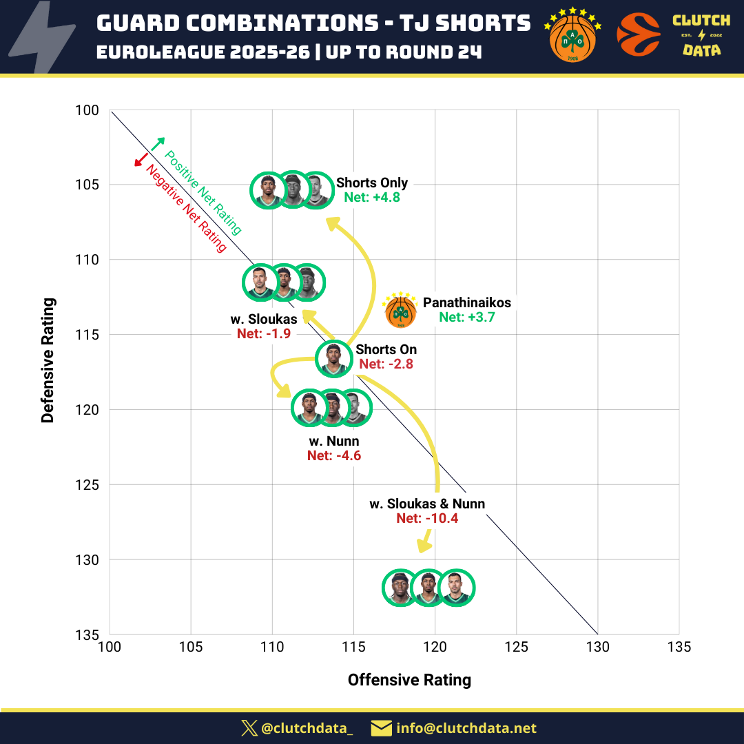 There has been a lot of discussion about the integration of TJ Shorts into the team with many observers fearing a 2024-25 Lorenzo Brown scenario. Together with Sloukas, Panathinaikos posts a -1.9 Net Rating; with Nunn, -4.6. In fact, under nearly all lineup conditions, Shorts’ minutes correlate with a negative overall impact, as the team records a -2.8 Net Rating when he is on the floor.