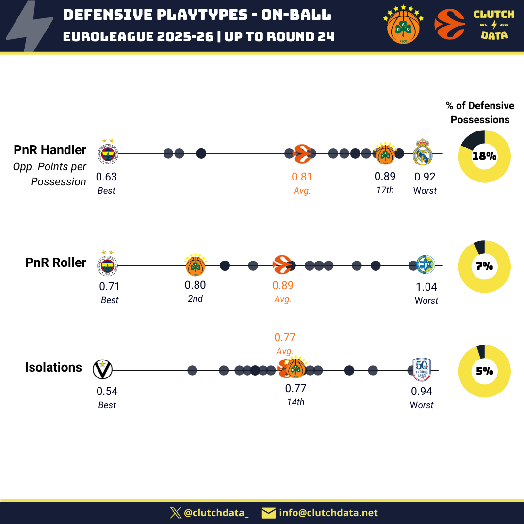 Let’s take a look at the other side of the court. As we mentioned, Panathinaikos’ offensive potential based on their roster is immense. However some questions still remain on defense, especially with Mathias Lessort being sidelined. The team is ranked near the bottom of the league on multiple play types. When it comes to On-ball defense the team is ranked 17th in Pick & Roll Handler defense with their opponents scoring 0.89 Points per Possession (PPP) and this is an action that PAO faces in 18% of their defensive Possessions. On the other hand, the team is ranked 2nd-best in terms of Pick & Roll Roller actions (0.80 PPP allowed) and is below average in Isolations ranking 14th (0.77 PPP allowed).