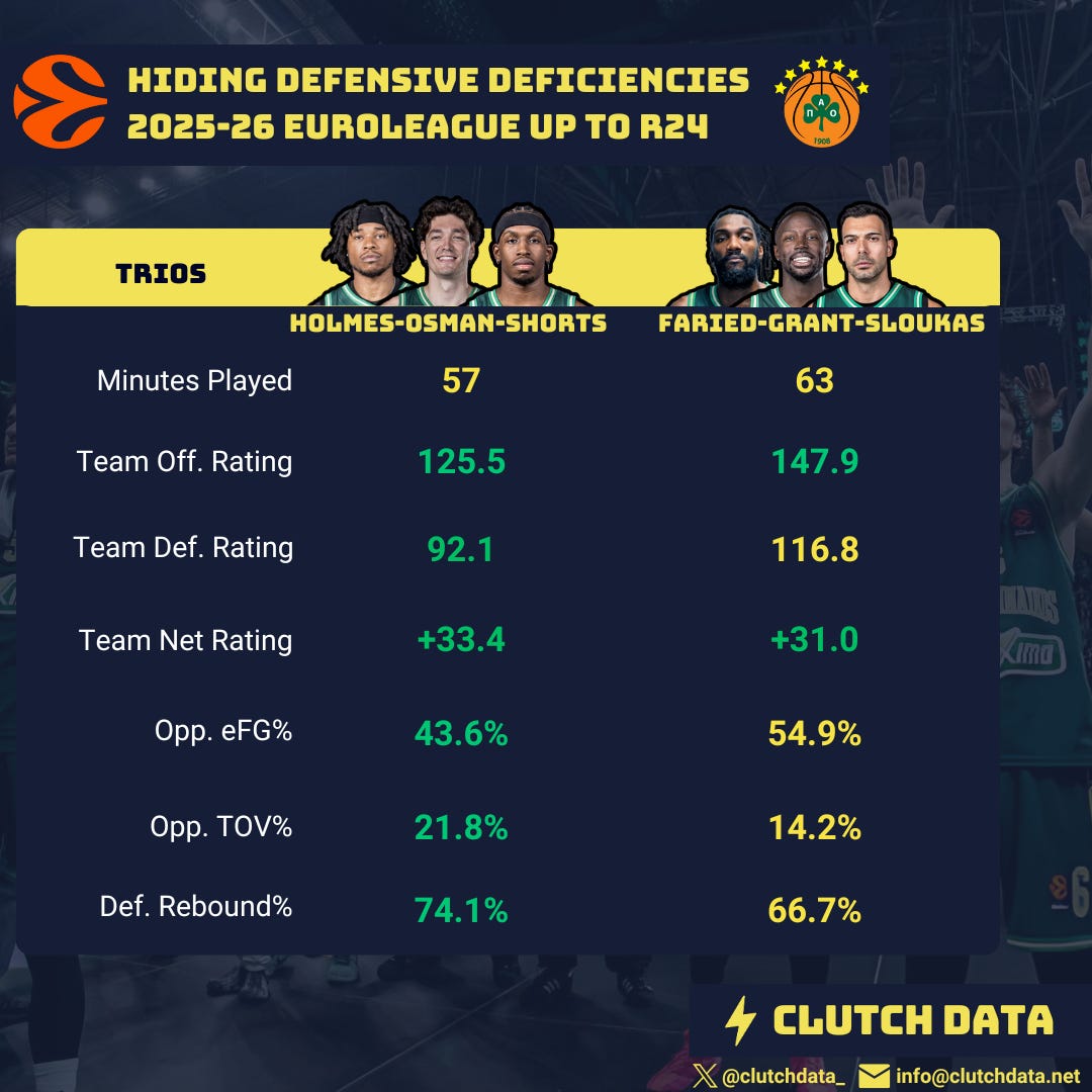 The implication is clear: guard defense at Panathinaikos is highly context-dependent, and optimal lineup construction can significantly soften individual limitations.