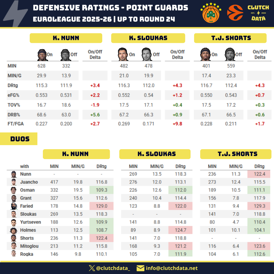 At the point of attack, Panathinaikos faces clear defensive challenges. All three primary guards negatively affect the team’s defensive efficiency when evaluated in isolation: