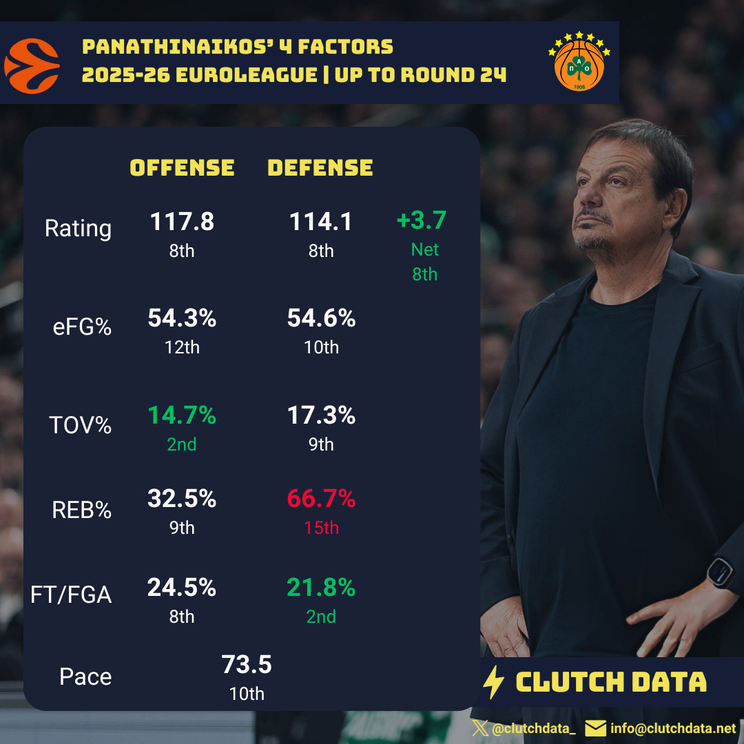 Through Round 24, Panathinaikos ranks 8th in both Offensive and Defensive Rating. They score 117.8 points per 100 possessions while conceding 114.1, resulting in a +3.7 Net Rating, also 8th in the league.
