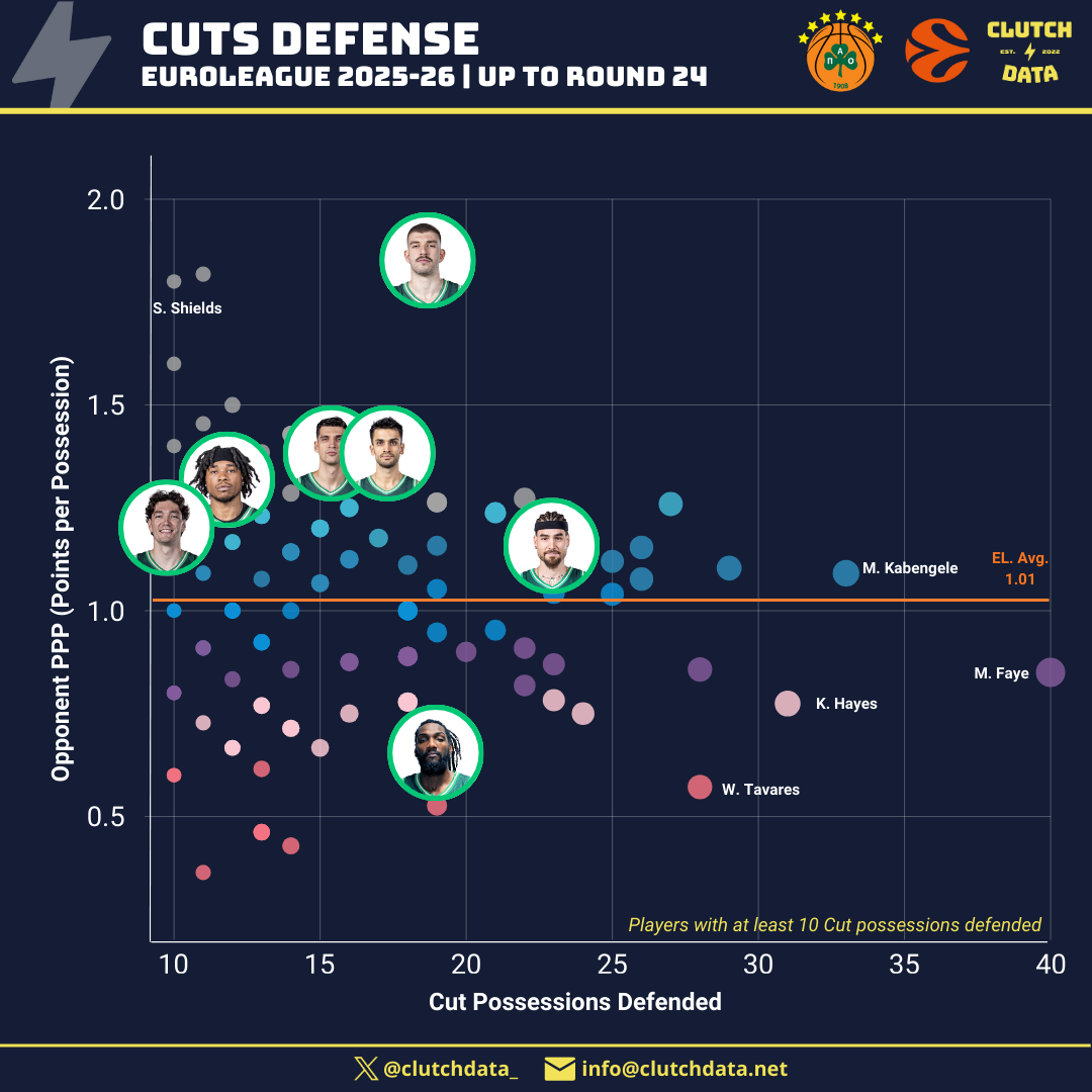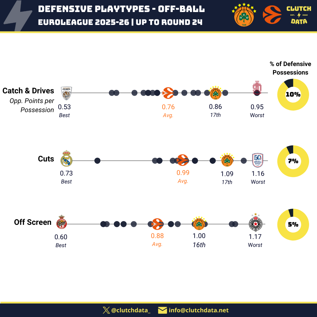 When the defense is forced to rotate and scramble, Panathinaikos falters. They rank 17th in Catch & Drives (0.86 PPP), 17th in Cuts (1.09 PPP), and 16th in Off-Screen actions (1.00 PPP).