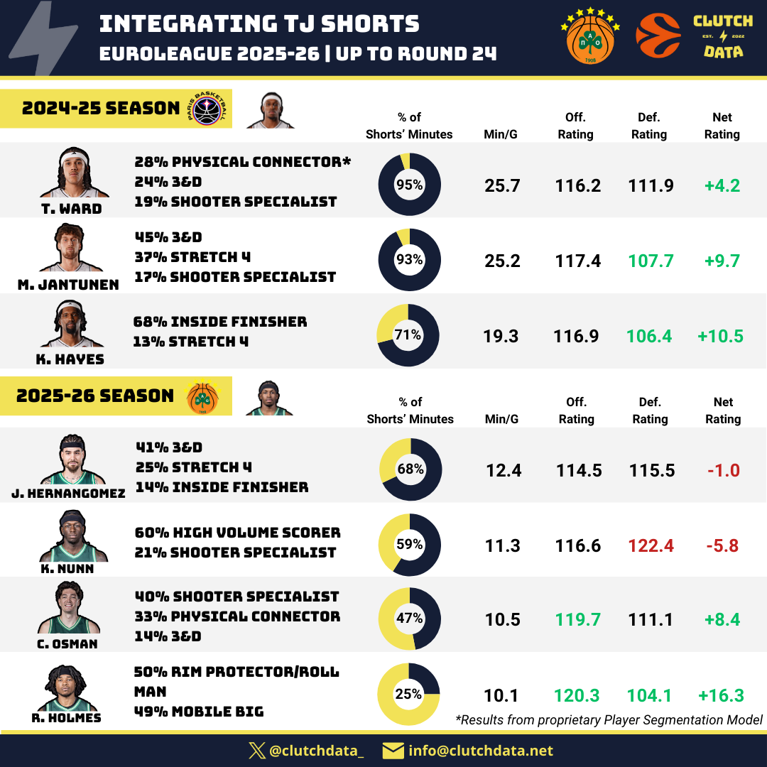 At Panathinaikos, the landscape is different. Shorts shares most of his minutes with Juancho (68%), Nunn (59%), Osman (47%), and Holmes (25%). The lineup data shows just how sensitive his impact is to context and we can already see the potential for Shorts to be the best version of himself as when he shares the court with players with similar characteristics as his teammates from last year: