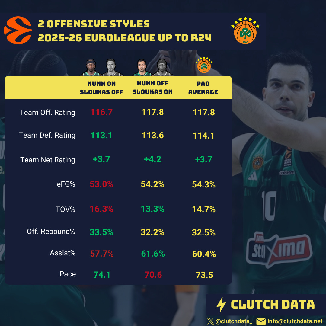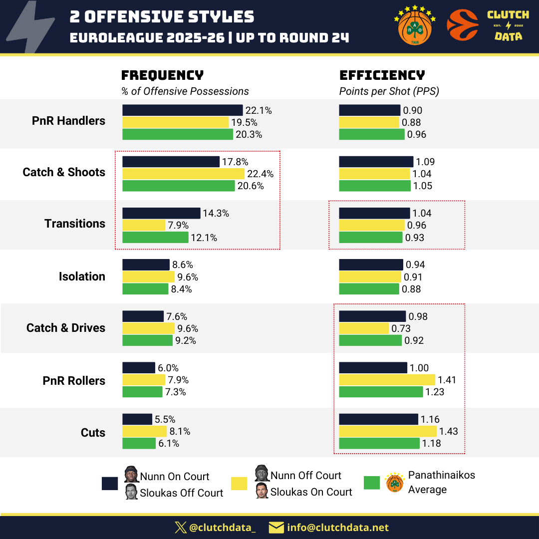 While both Sloukas and Nunn drive positive results, they do so in fundamentally different ways. It’s evident that the team has 2 distinct offensive styles when each one is on the floor. Sloukas is an elite playmaker and facilitator and can make everyone around him better. With Sloukas on the floor and Nunn off, Panathinaikos maintains its offensive output while improving defensively. Ball security improves (13.3% TOV%), and 61.6% of baskets are assisted. The trade-off is pace, which slows considerably.