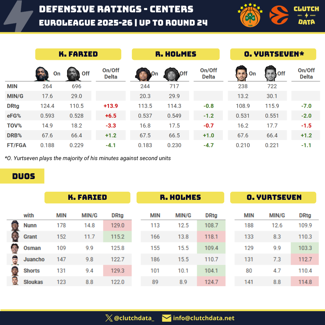 Shorts sees his best defensive results next to Osman (111.1), Yurtseven (110.4), Holmes (104.1), or Rogkavopoulos (112.6).