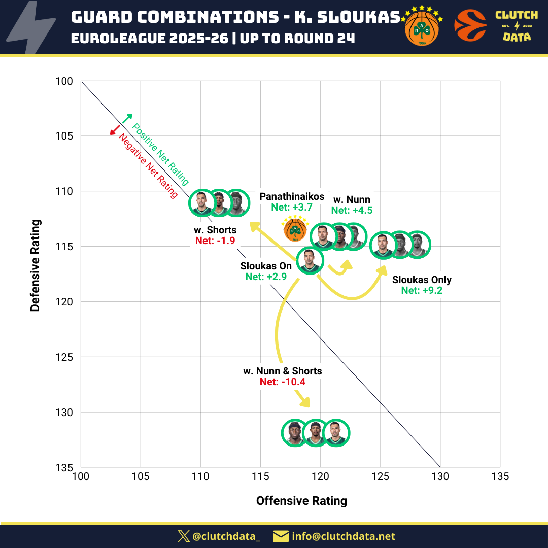 The pairing with Nunn once again yields positive returns (+4.5 Net Rating). When Sloukas operates alone, the offense flourishes, reaching 124.5 points per 100 possessions and producing a +9.2 Offensive Rating. Yet, as with Nunn, adding Shorts tilts the balance negatively, resulting in a -1.9 Net Rating.