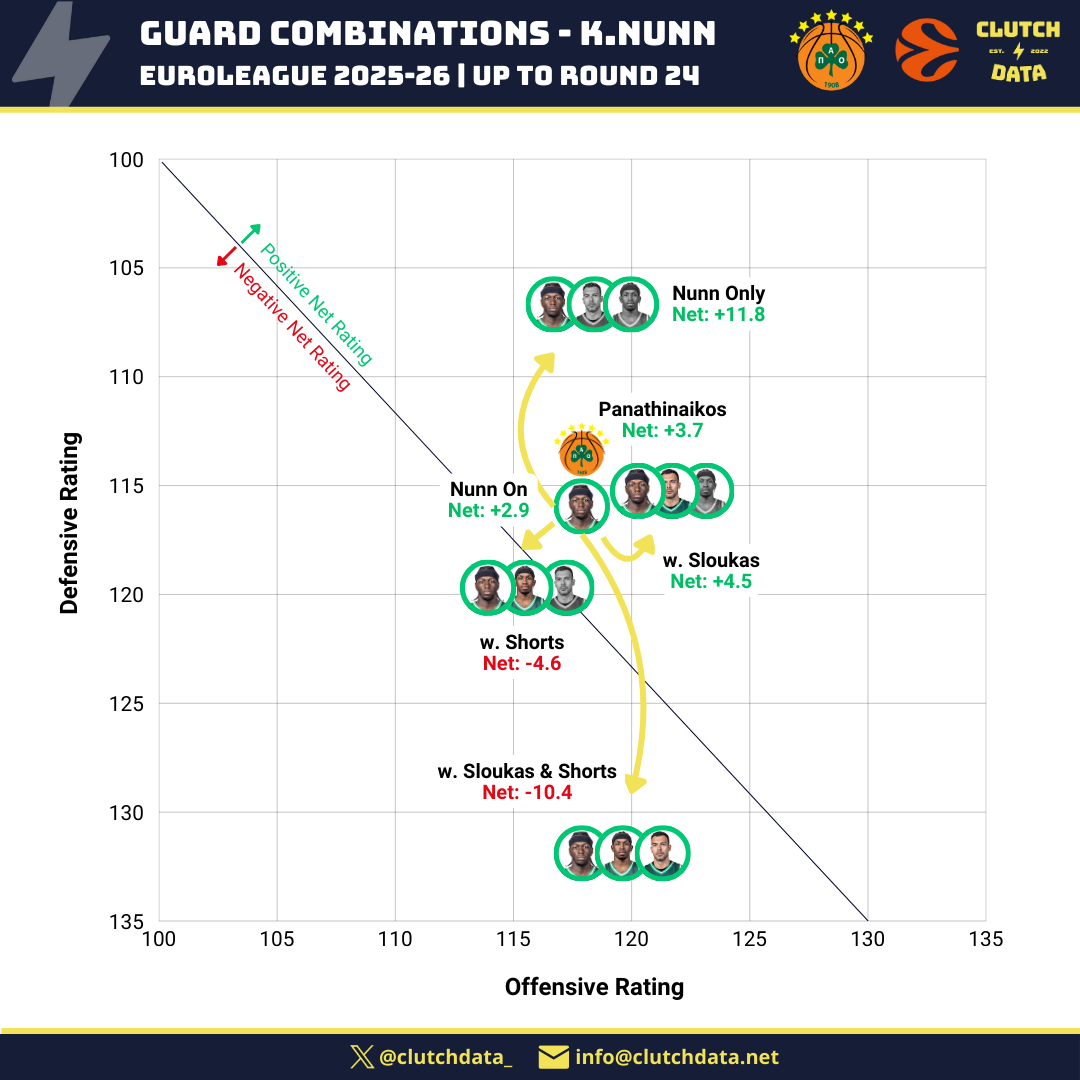 With Kendrick Nunn on the floor, Panathinaikos posts a +2.9 Net Rating regardless of lineup. That figure spikes dramatically to +11.8 when Nunn plays without either Sloukas or Shorts, surprisingly driven primarily by a defensive improvement that drops the Defensive Rating to 106.7.
